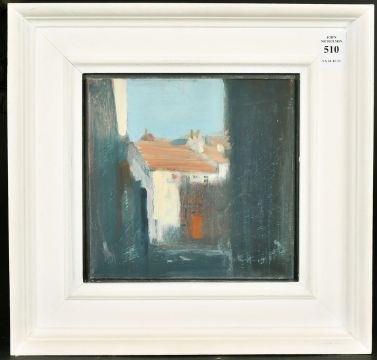 20th Century School, a study of rooftops in sunlight, oil on board, indistinctly signed with initials, 6.75" x 6.5" (17 x 16cm).
