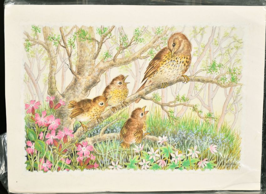 Ella Bruce (20th Century, Fledglings with mother on a branch, watercolour, signed, 7.5" x 10", (18.5x25cm) (unframed).