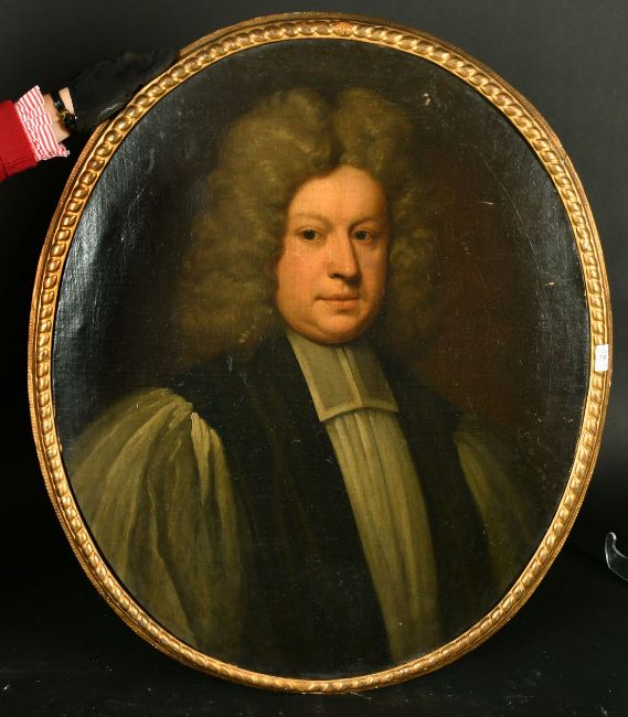 Circle of Enoch Seeman, a portrait of The Reverend Alexander Alcock, Chancellor of the Diocese of Waterford and Dean of Lismore, oil on canvas, 30" x 24.5" (76 x 62cm), oval, in a carved frame.