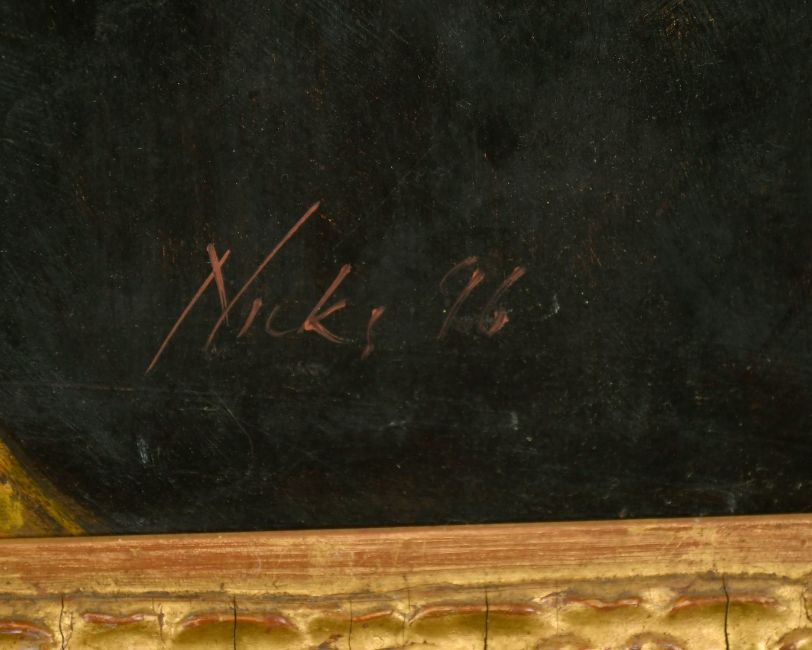 Kanwaldeep Singh Kang, signed Nicks (1964-2007) British, a dancing female nude surrounded by gold streamers and flying sparks, oil on board, signed and dated 1996, 41.5" x 35.5", (105.5x90cm), from the artist's studio collection.