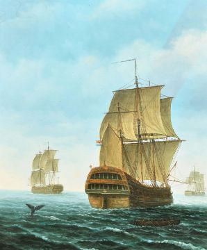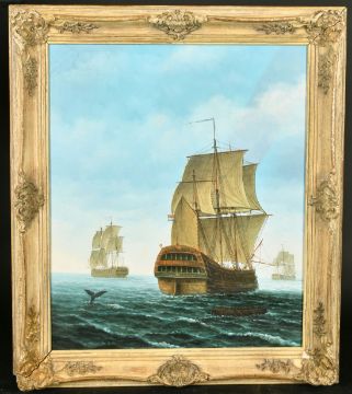 20th Century, Three Man-of-War and men in a rowing boat following a whale's flukes, oil on canvas laid on board, 24" x 20", (61x51cm).