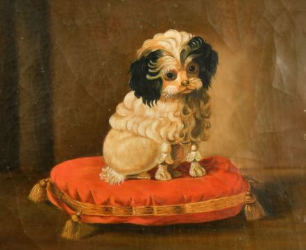 Late 19th/Early 20th Century Continental School, a groomed dog sat on a red cushion, oil on canvas, 9.75" x 11.75" (25 x 30cm).