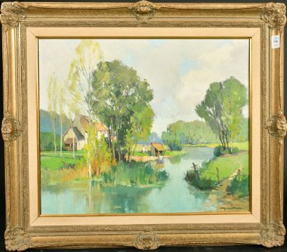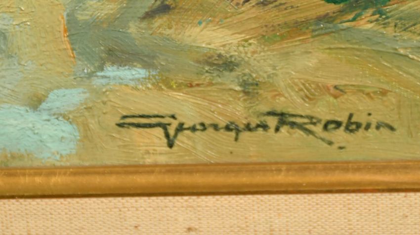 Georges Robin (1903-2003) French, 'Sur le Thouaret', figures by a river, oil on canvas, signed, 18" x 21.5" (46 x 54cm).