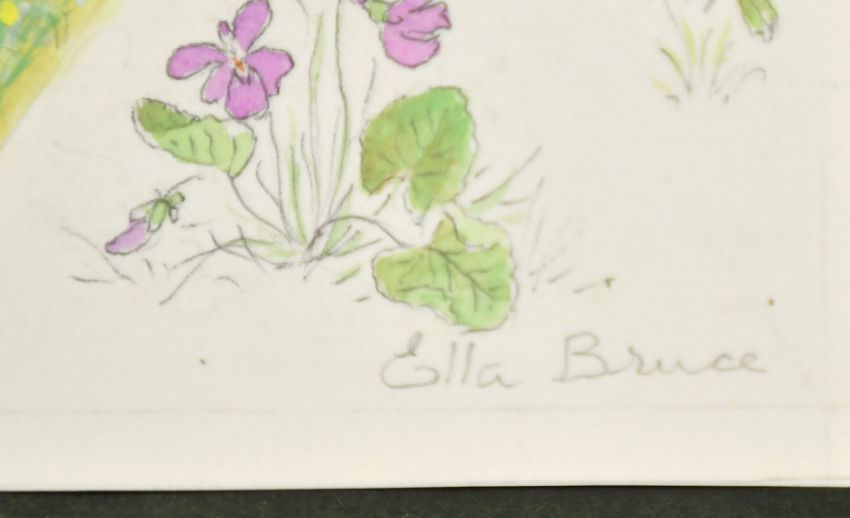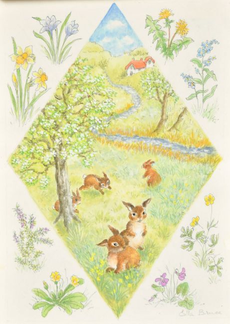 Ella Bruce (20th Century) A group of rabbits in Springtime and wildflowers, watercolour, signed in pencil, 9.5" x 6.75", (24x17cm) (unframed).