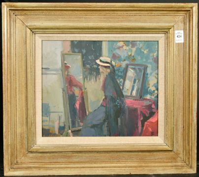 Tom Coates (b. 1941), a lady looking in the mirror, oil on board, signed with initials, 10.5" x 12.5" (27 x 32cm).