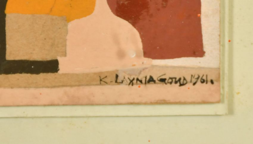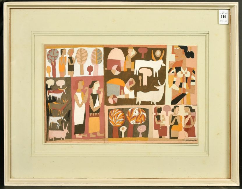 Kalal Laxma Goud (B. 1940) Indian, an untitled composition of scenes of figures, cattle and trees, gouache on card, signed and dated 1961, image size 8.25" x 14" (21 x 36cm).