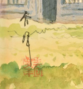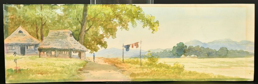 Japanese School (early 20th Century) A lady by a river and a figure on a country track, watercolours, both signed, with red seals and 6" x 19.25", (5x49cm) (unframed) (2).