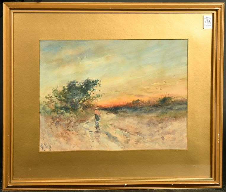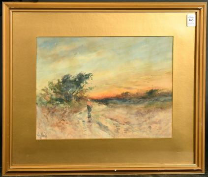 Henry Woods, A woman on a country track at sunset, watercolour, signed, 10" x 14.5", (25.5x37cm).