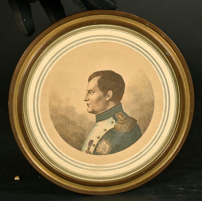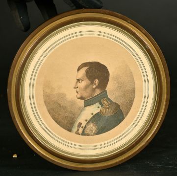 After Kauffman, a circular print of classical figures, 11.5" (29cm) diameter, along with another similar oval and a smaller print of Napoleon, (3).