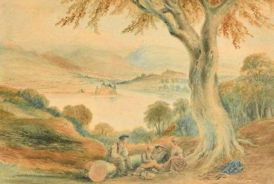 Horatio McCulloch (1805-1867) Scottish, wayfarers resting with a view of Loch Awe and Kilchurn Castle in the distance, watercolour, signed, 14" x 20.75" (36 x 53cm).