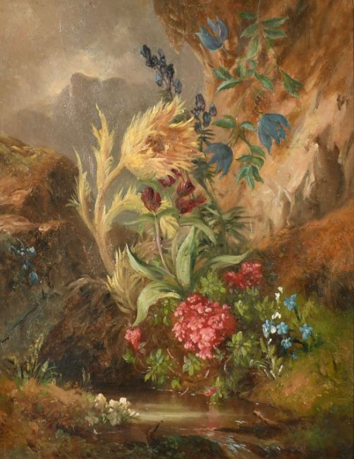 Josef Schuster (1812-1890) Austrian, a still life study of wildflowers by a mountain stream, oil on card, signed, 10.5" x 8.25" (27 x 21cm).
