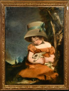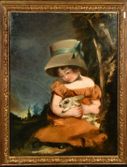 19th Century English School, 'Girl with a rabbit', After Hoppner, oil on canvas, 30" x 25", (76x63.5cm).
