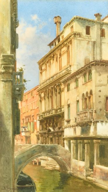 Alberto Prosdocimi (1852-1925) Italian, a view of a bridge over a Venetian Canal, watercolour, signed, 11.75" x 6.5" (30 x 16.5cm).