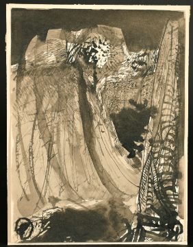 Circle of Graham Sutherland, View of a steep gorge with a lake, black ink and wash, 9.25" x 7", (23.5x18cm).