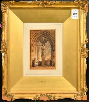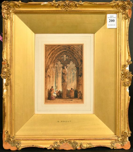 Samuel Prout (1783-1852) A cathedral interior with figures, watercolour, 5" x 3" (12.5x7.5cm).