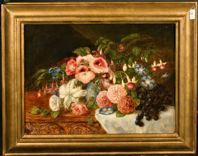 English School, circa 1894, A still life of mixed flowers, grapes and a butterfly, oil on canvas, indistinctly signed and dated, 14.5" x 19.5", (37x49.5cm).