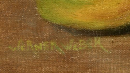 Werner Weber (1892-1977) A still life of fruit, bananas, grapes and an apple, oil on canvas, laid down, 8.75" x 17", (22x43.5cm) (unframed).