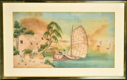 19th Century Chinese Export School, a pair of watercolour scenes of figures by the water's edge, one in summer one in winter, each 15" x 26.75" (38 x 68cm) (2).