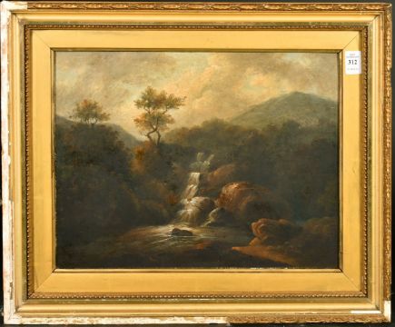 Circle of W.W. Gill, A waterfall and pool in a mountain landscape, oil on canvas, 12" x 16", (30.5x41cm).