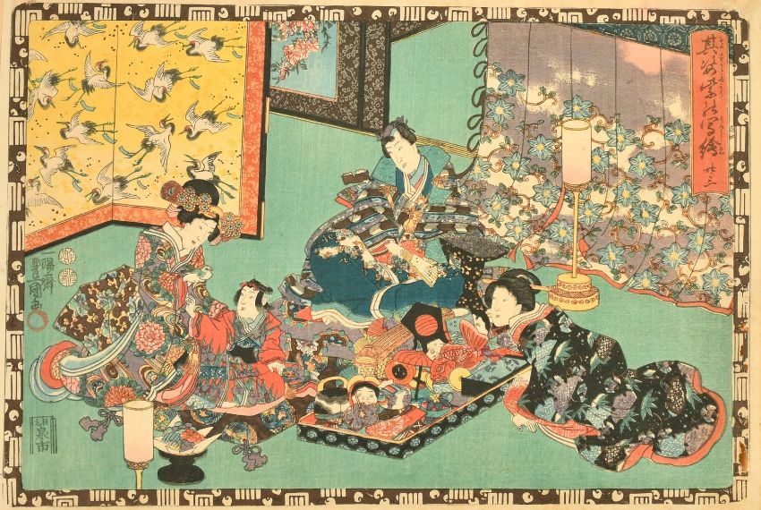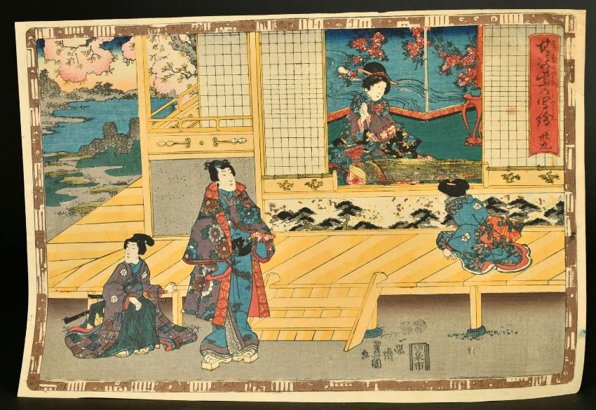 Kunisada, Two 19th Century Japanese woodblocks, figures in leisurely pursuits, various seals and inscriptions, 9.75" x 14.5", (24.5x37cm) (unframed) (2).