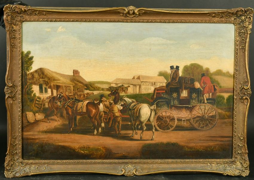 Circle of John Charles Maggs, changing horses on a stagecoach, oil on canvas, indistinctly dated, 18" x 27", (46x68.5cm).