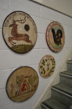 Four decorative painted circular wooden plaques.