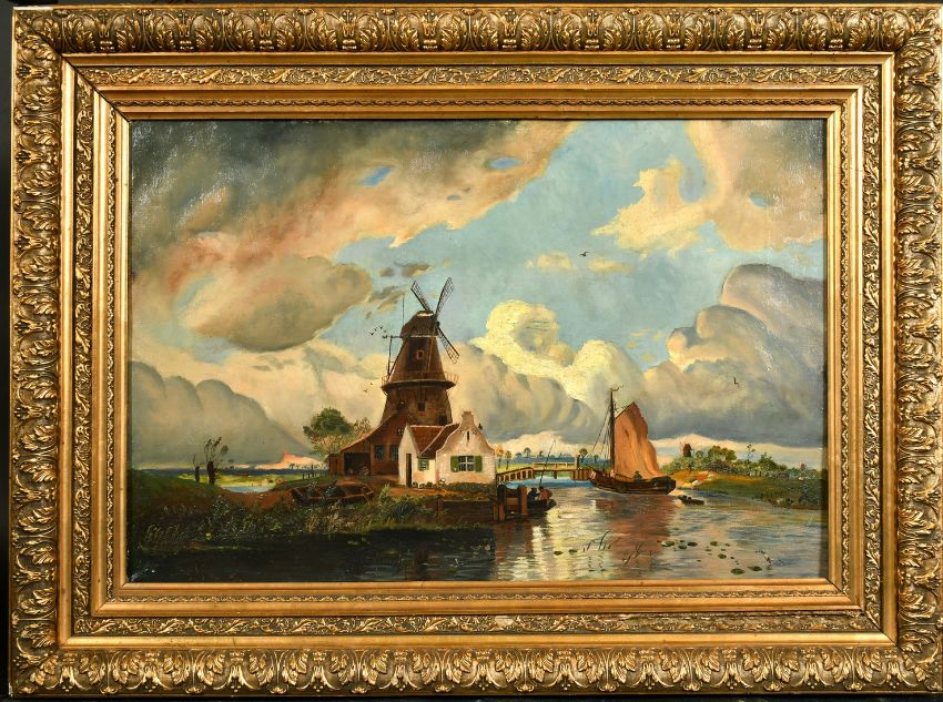 19th Century, a river landscape with a windmill and figures on a barge, oil on canvas, 15.5" x 23.5", (39.5 x 60cm).