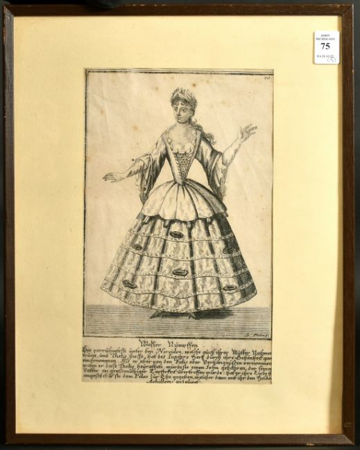 Johan Christoph Dehne, four 18th Century wood engravings of single figure subjects, 11.75" x 6.5", (30 x 16.5cm) and a wood engraving of a Knight by another hand also 18th Century, (5), a/f.