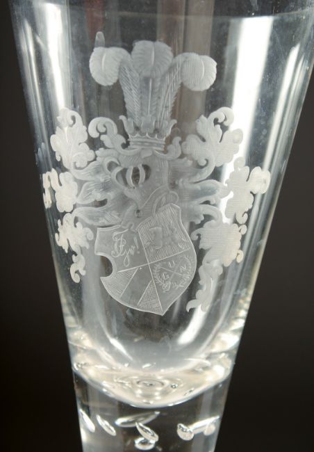 A GOOD TALL TAPERING GLASS engraved with a crest.