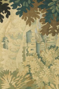 A LATE 19TH CENTURY CONTINENTAL TAPESTRY WALL HANGING depicting animals and birds in a woodland setting, a building in the distance, within a floral border.
