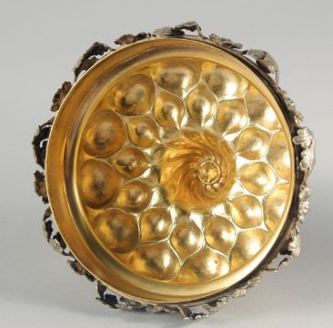 A GOOD CONTINENTAL SILVER GILT CHALICE AND COVER of 17th Century design, with bands of silver flowers and leaves.