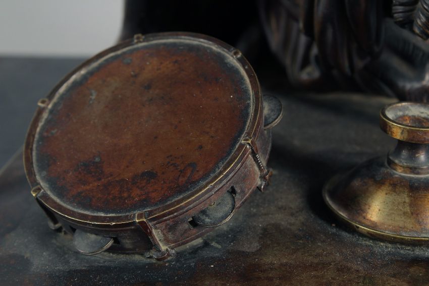A CLASSICAL BRONZE GROUP, SATYR AND NYMPH with tambourine and up-turned chalice, on a rectangular base.