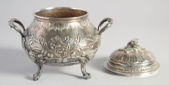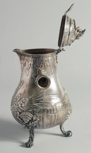 A VERY GOOD VICTORIAN SILVER FOUR PIECE TEA SET with floral repousse decoration, shells supported on curving legs, comprising: tea pot, hot water jug, sugar basin and cover and milk jug. Weight 66ozs.
