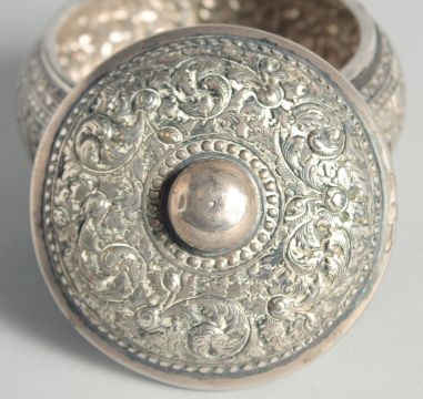 AN CAMBODIAN SILVER CIRCULAR LIDDED BOX, with embossed and engraved foliate decoration, stamped to base, 10cm diameter.
