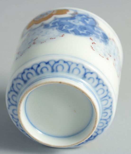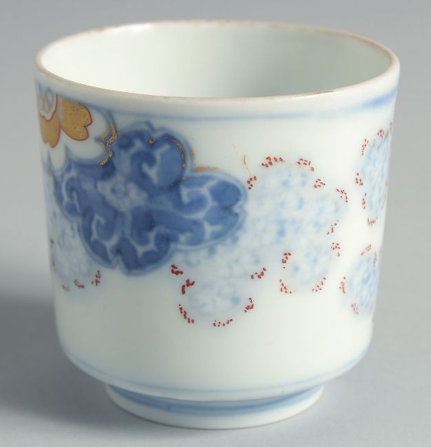 A JAPANESE BLUE AND WHITE PORCELAIN CUP, decorated with foliate motifs and gilt highlights, 6.5cm high.
