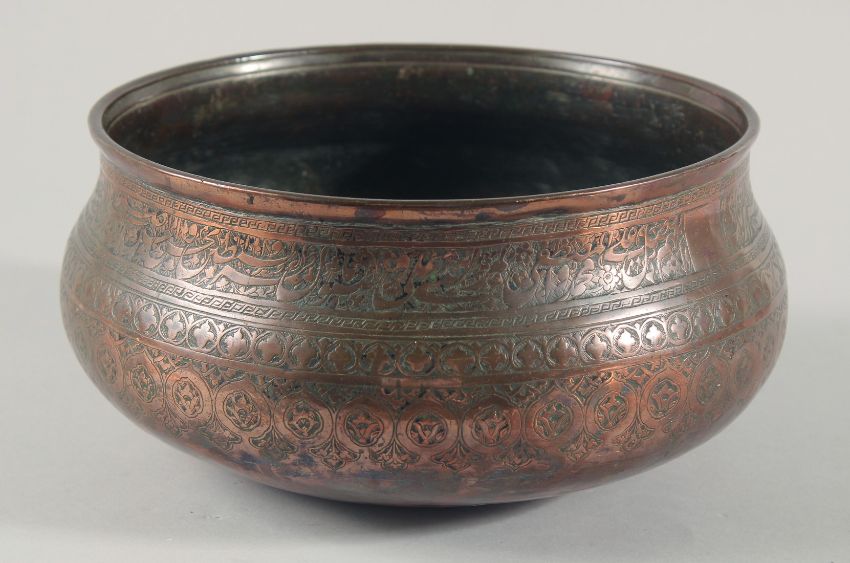 A FINE LARGE 17TH CENTURY PERSIAN SAFAVID COPPER BOWL, engraved with a band of calligraphy and foliate motifs, 26cm diameter.