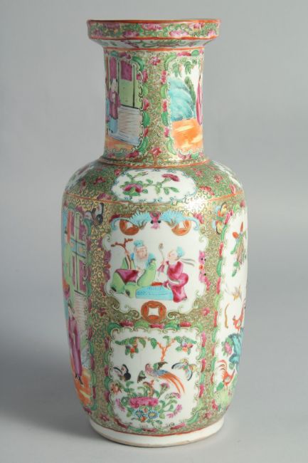 A CHINESE CANTON FAMILLE ROSE PORCELAIN VASE, painted with panels of figures, birds and butterflies, (af), 34.5cm high.