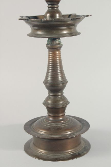 A LARGE INDIAN BRONZE OIL LAMP, the top with bird formed finial, 62cm high.
