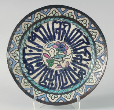 A 19TH CENTURY SYRIAN ENAMELLED METAL DISH, with central bird and flower motif and calligraphy, 38cm diameter.