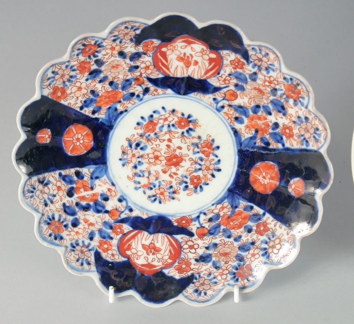 THREE JAPANESE IMARI PORCELAIN PLATES, one painted with a central dog, the other two with flora, largest, 24.5cm diameter, (3).