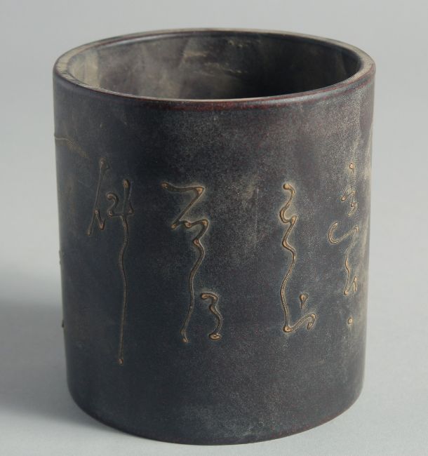 A CHINESE YIXING CYLINDRICAL BRUSH POT, with character mark to base, 11.5cm high