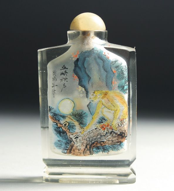 A CHINESE REVERSE PAINTED GLASS SNUFF BOTTLE with hardstone stopper, decorated with a monkey to one side and two dogs to the reverse, inscribed, 12.5cm high.