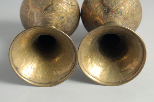 A PAIR OF CAIROWARE SILVER AND COPPER OVERLAID BRASS VASES, with panels of calligraphy, 23cm high.