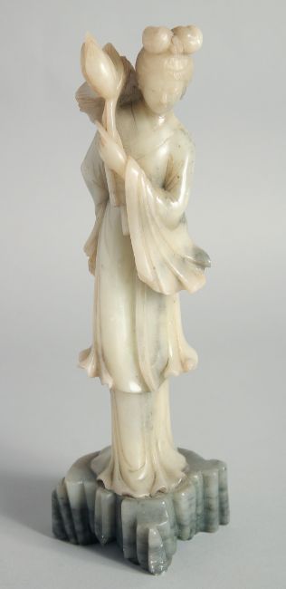 A CHINESE CARVED JADE FIGURE OF GUANYIN, 29cm high.