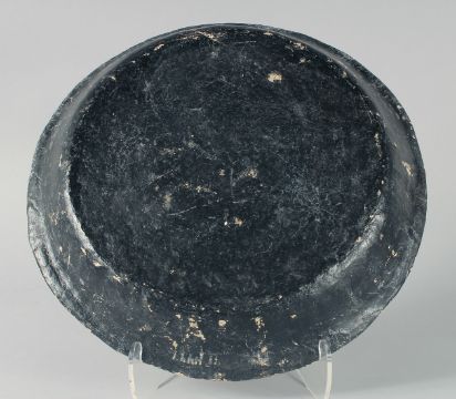 A LARGE INDIAN KASHMIR LACQUERED DISH, the centre painted with a male and female riding a camel, 38cm diameter.