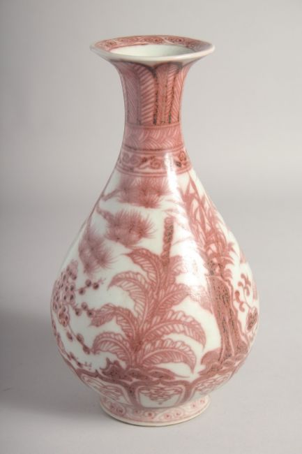 A CHINESE COPPER RED AND WHITE YUHUCHUNPING VASE, 28cm high.
