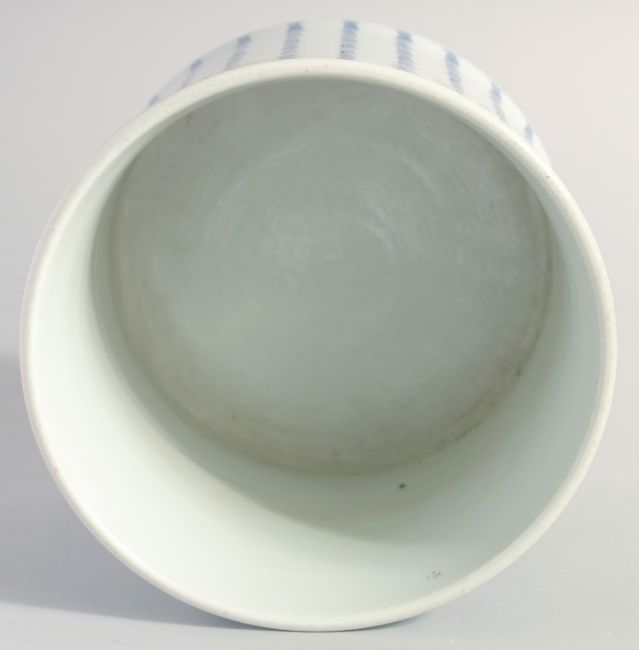 A LARGE CHINESE BLUE AND WHITE PORCELAIN BRUSH POT, with columns of characters, 17cm high.