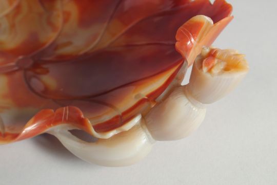 A VERY LARGE CHINESE AGATE-TYPE LEAF FORM DISH, 31cm long.