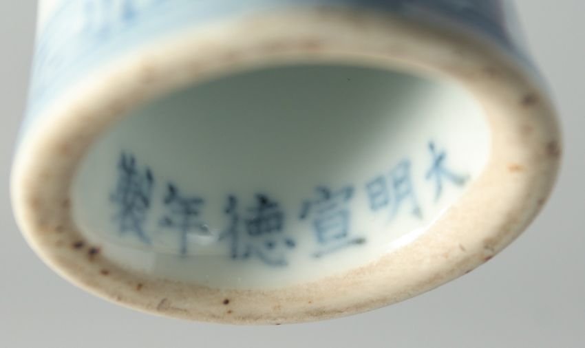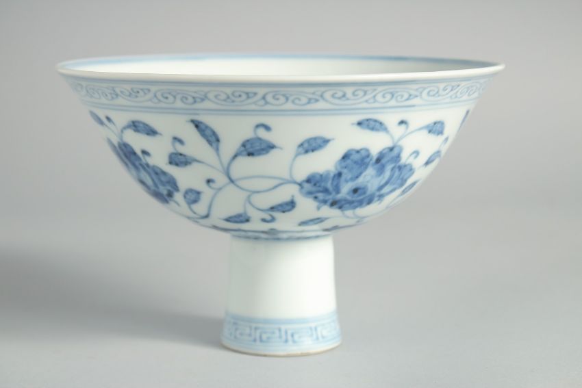 A CHINESE BLUE AND WHITE PORCELAIN STEM CUP, decorated with flowers and vine, with six-character mark, (hairline), bowl 17cm diameter.