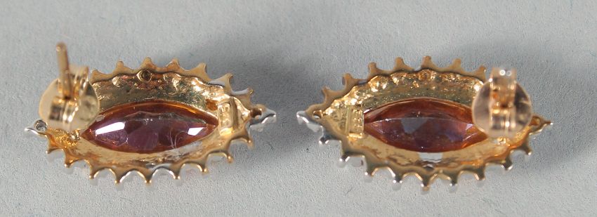 A PAIR OF 9ct. GOLD TOPAZ AND DIAMOND MARQUISE EARRINGS.